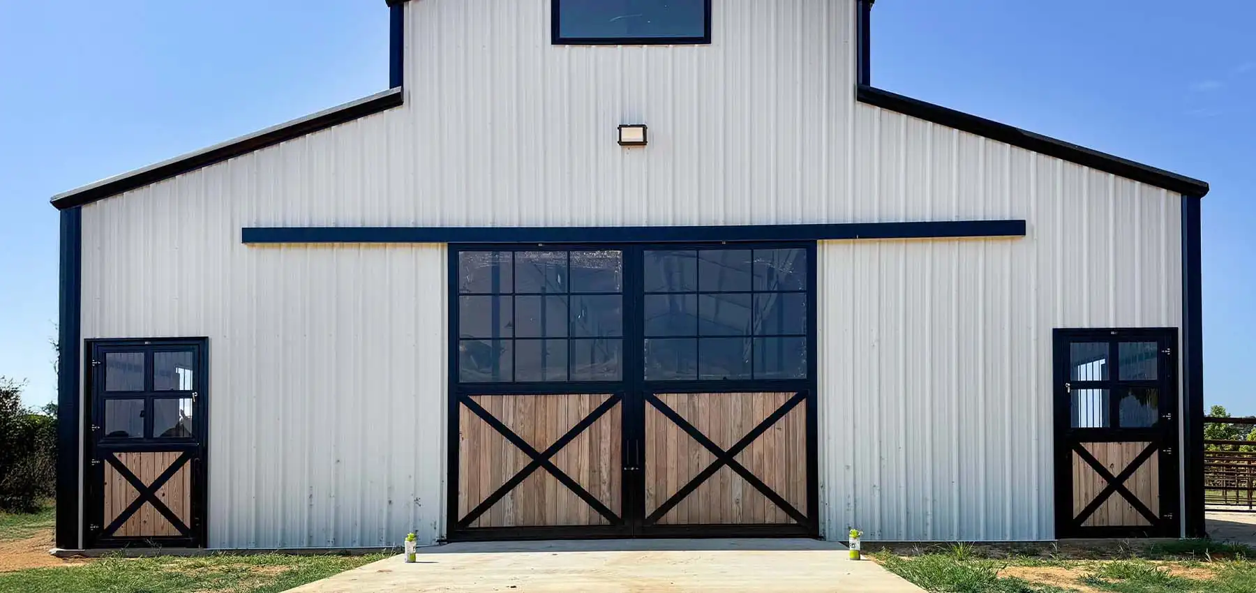 Framed by the Texas landscape, this 10-stall horse barn pairs rich wood and black steel with thoughtful airflow and light. Legend Series sliding-door stall fronts and matching barn-end doors create a seamless, functional design built for comfort and performance.